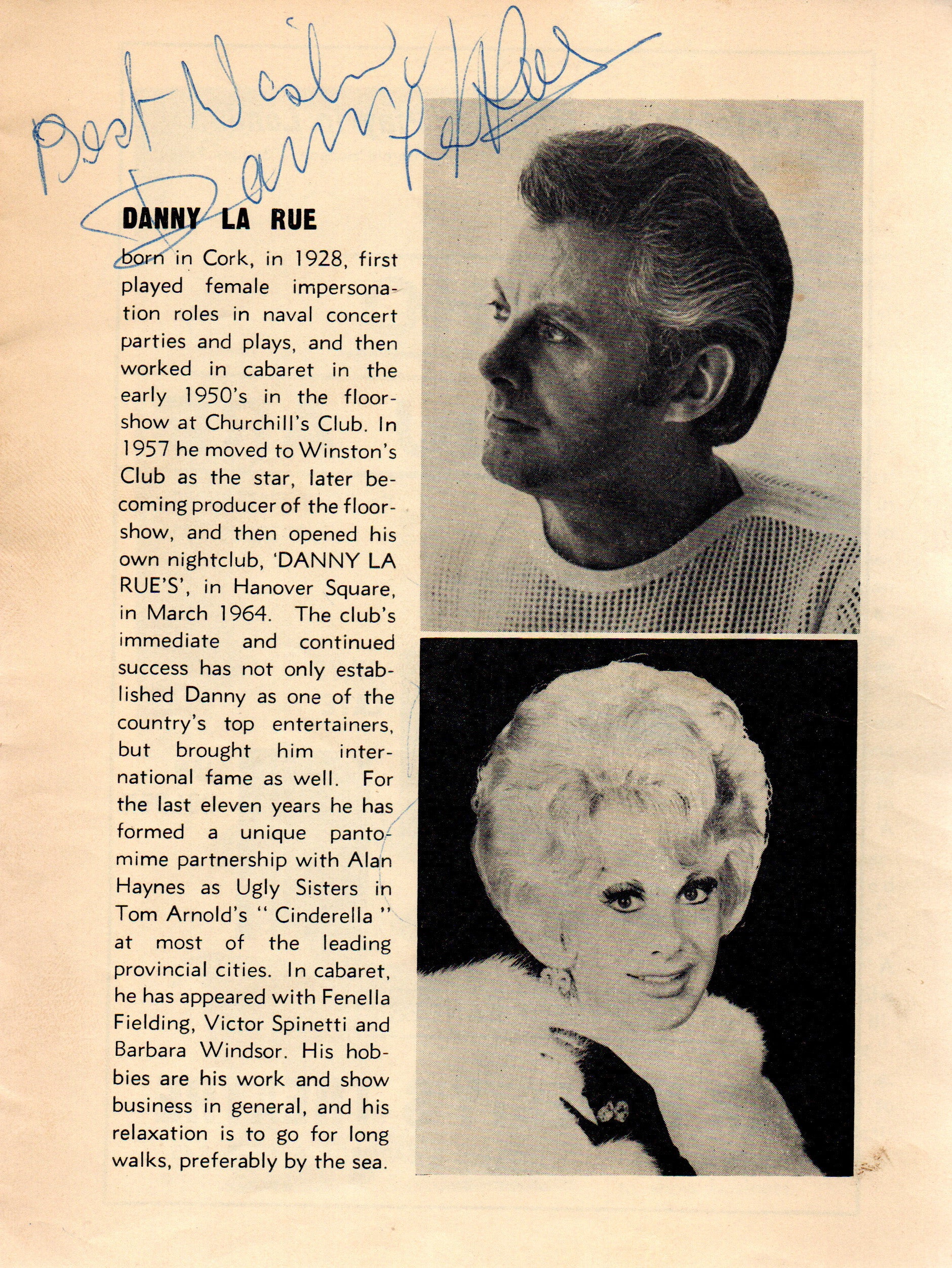 in een spionnen comédie musical. Na afloop stond bij de Stagedoor zijn Rolls Royce met chauffeur klaar om Danny La Rue naar zijn eigen nachtclub te brengen, waar hij elke avond optrad.